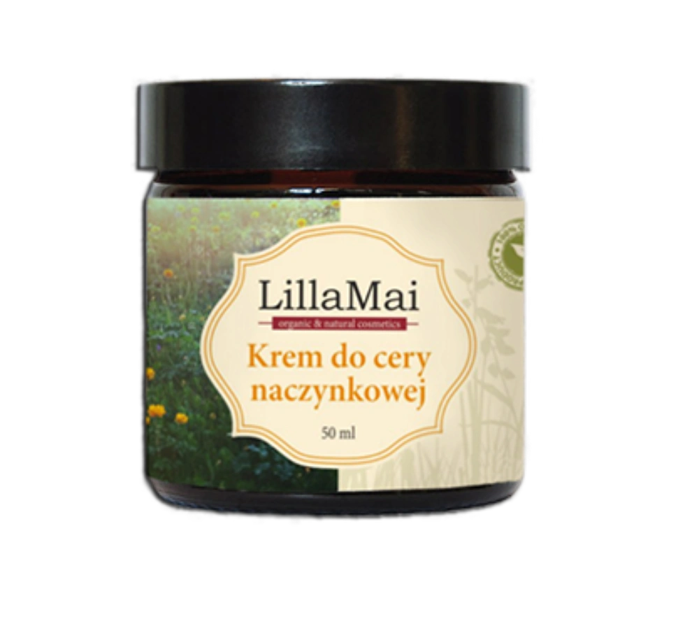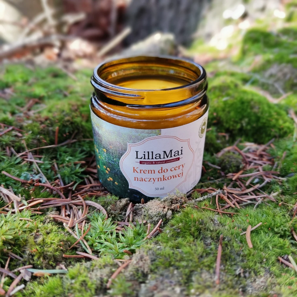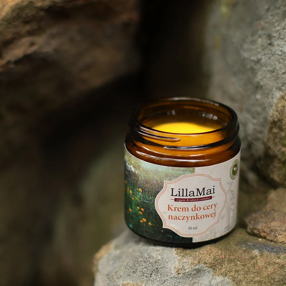 Krem do cery naczynkowej LillaMai – naturalna formuła wzmacniająca naczynka i redukująca zaczerwienienia. Z ekstraktami roślinnymi, witaminą C i antyoksydantami. Idealny dla skóry wrażliwej i naczynkowej. Ręcznie produkowany w Polsce.