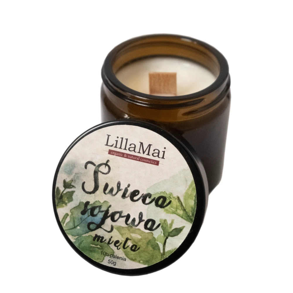 Naturalna świeca sojowa o zapachu mięty zielonej – wegańska, z wosku sojowego i oleju słonecznikowego. Drewniany knot, świeży zapach bez sztucznych aromatów. Waga: 50 g, czas palenia: 10-12h.